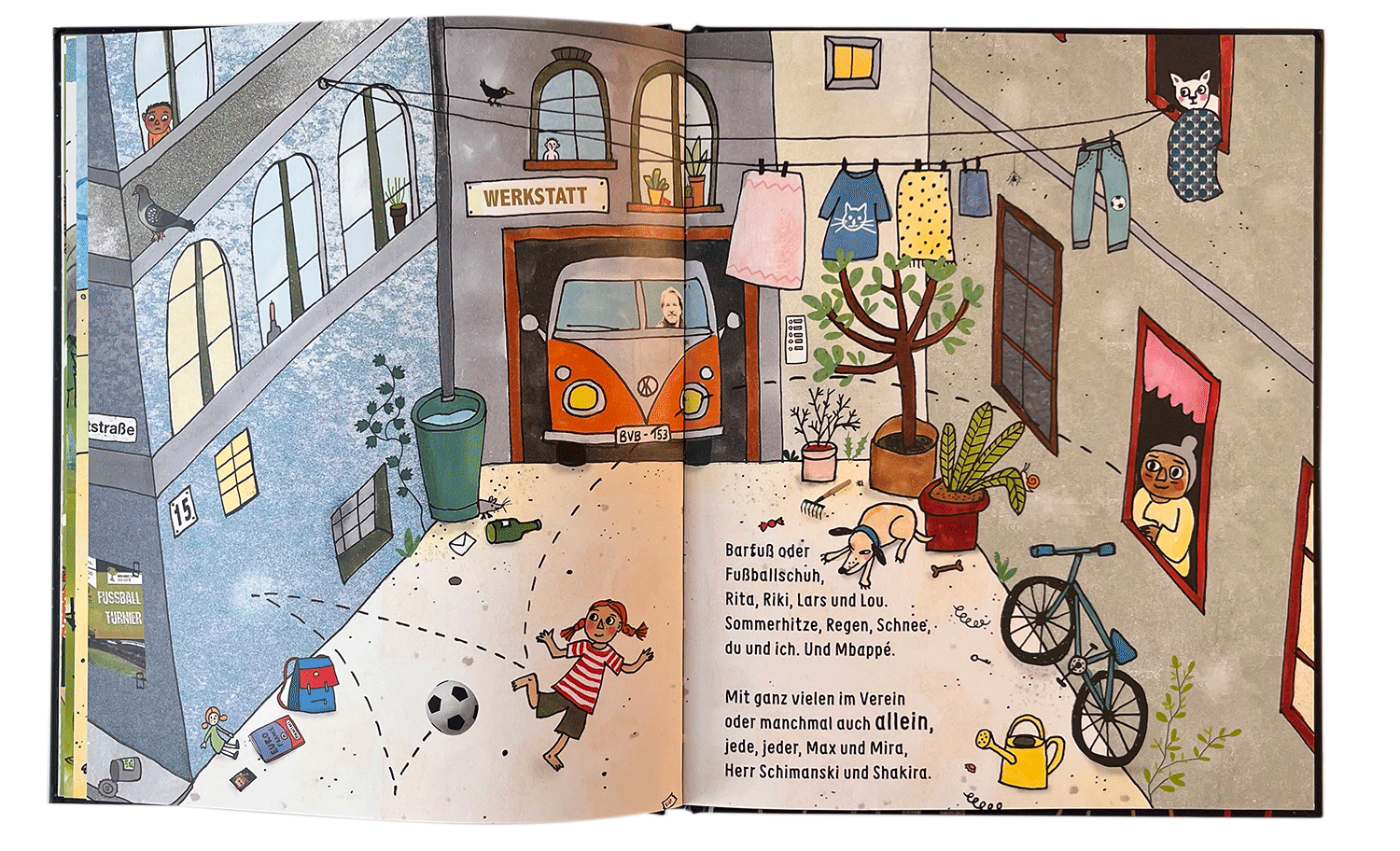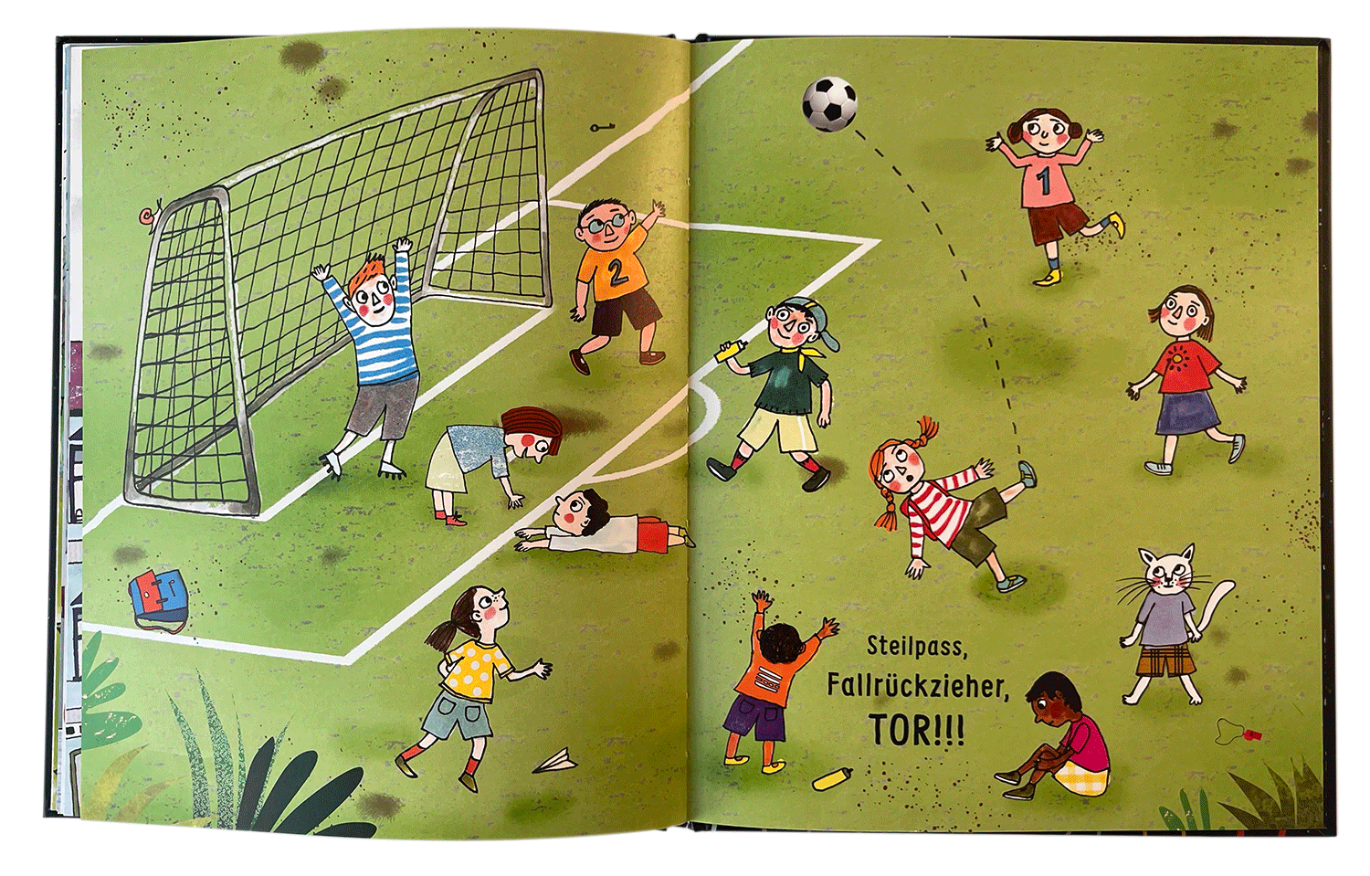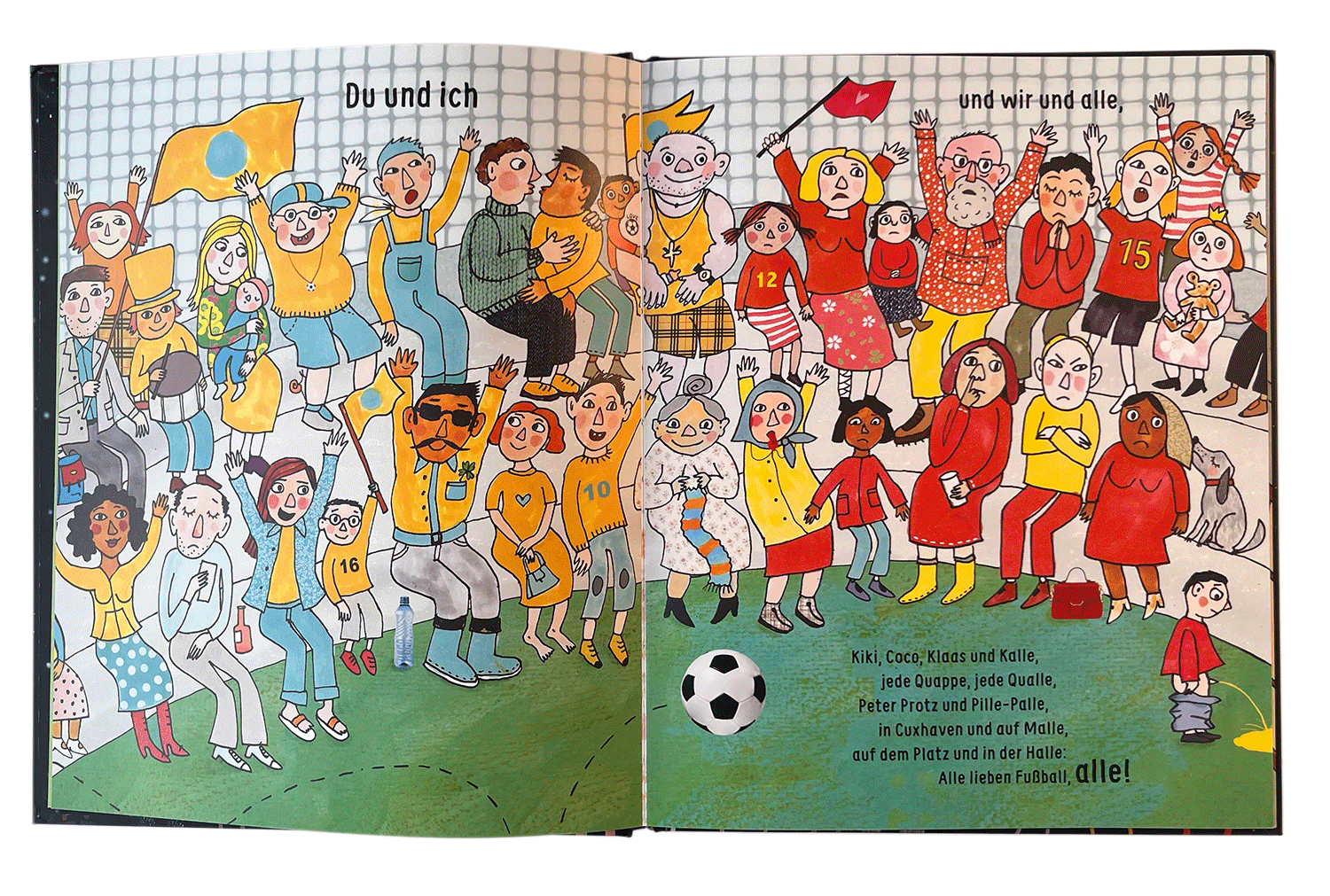 Kiki, Coco, Klaas und Kalle, jede Quappe, jede Qualle - alle lieben Fußball, alle! Temporeich und frech wie ein Rapsong feiert dieses Bilderbuch den Fußball als eine Leidenschaft, die den Globus umspannt: Ich am Rhein und du in Riga, 5. oder Bundesliga, Lappland oder Senegal, Grönland, Tokio, Wuppertal, - nicht so wichtig und egal! Das laute (Vor-)Lesen der Verse ist Spaß und Challenge zugleich. Und zum Entdecken unzähliger kleiner Geschichten auf den witzig-wimmeligen Bildern von Antje Damm gehen die Fans gerne in die Verlängerung!